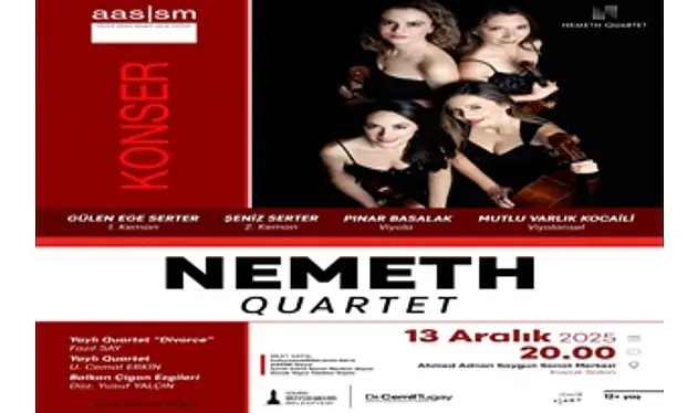 Nemeth Quartet konseri, 13 Aralık’ta Küçük Salon’da saat 20.00’de düzenlenecek. 1995 yılında kurulan ve isimlerini aynı yıl trafik kazasında hayatlarını kaybeden hocaları Istvan Nemeth (keman) ve Katalin Nemeth’ten (çello) alan grup; Gülen Ege Serter (keman), Şenis Serter (keman), Pınar Basalak (viyola) ve Mutlu V. Kocaili’den (çello) oluşuyor. Konserin bilet satışı kultursanatbilet.izmir.bel.tr adresi üzerinden yapılıyor.