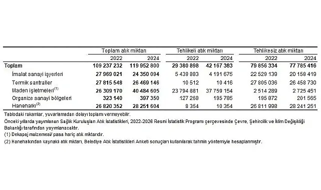 Araştırma kapsamındaki imalat sanayi işyerleri, maden işletmeleri, termik santraller, organize sanayi bölgeleri (OSB) ve hanehalklarında 2024 yılında 42,2 milyon tonu tehlikeli olmak üzere toplam 120 milyon ton atık oluştu.