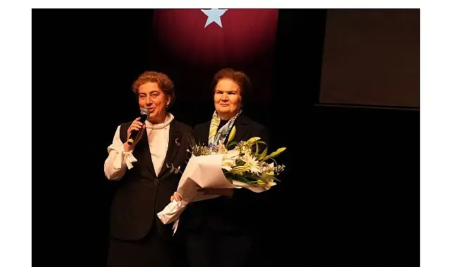 Yad-ı Mevlana Özel Anma etkinliğinin sonunda sahneye gelen Prof. Dr. Figen Büyükakın,  Hz. Mevlana’nın 22. kuşaktan torunu Neslipir Çelebi Sayar’a çiçek vererek katılımından dolayı teşekkür etti.