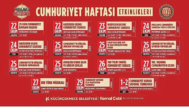 Cumhuriyet Haftası etkinlikleri; Küçükçekmece Göl Kenarında gerçekleştirilecek 29 Ekim Cumhuriyet Bayramı koşusu ile başlayacak. Ardından Küçükçekmece Belediyesi Rıfat Ilgaz, Kuşlu Çocuk ve İstasyon Gençlik Merkezi Kütüphanesi’nde; Hikâyeden Resme: Cumhuriyet Coşkusu ve Cumhuriyetin Kökleri, Umudun Yaprakları Atölyesi, Güzel Sanatlar Akademisi Performans Galerisi’nde Pusulamız Cumhuriyet: Sanatsal Puzzle Atölyesi ve Galeri Cennet’te 102. Yaşında Cumhuriyetin İzleri Atölyesi düzenlenecek. Ayrıca Çocuk Üniversitesi’nde; Atamızın İzinde Bilim ve Gözlem Şenliği, Sefaköy Galeri Küp’te 100 Yılın Tanığı: Cumhuriyet Sergisi, Cennet Kültür ve Sanat Merkezi’nde Bir Türk Müzikali, Küçükçekmece Espor Merkezi’nde Cumhuriyet Bayramı FC26 Playstation Turnuvası ve Yahya Kemal Beyatlı Gösteri Merkezi’nde ise Cumhuriyet Kupası Satranç Turnuvası gerçekleştirilecek.