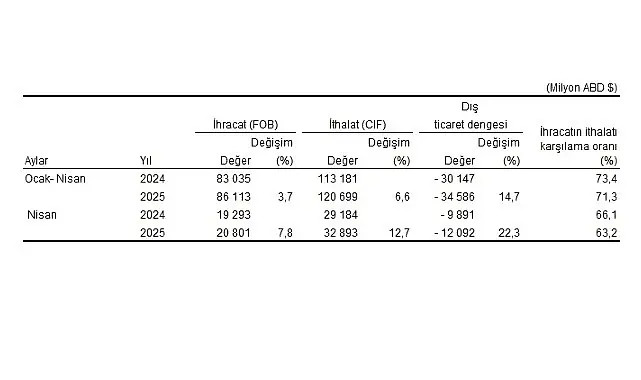 Türkiye İstatistik Kurumu ile Ticaret Bakanlığı iş birliğiyle genel ticaret sistemi kapsamında üretilen geçici dış ticaret verilerine göre; ihracat 2025 yılı Nisan ayında, bir önceki yılın aynı ayına göre %7,8 artarak 20 milyar 801 milyon dolar, ithalat %12,7 artarak 32 milyar 893 milyon dolar olarak gerçekleşti.