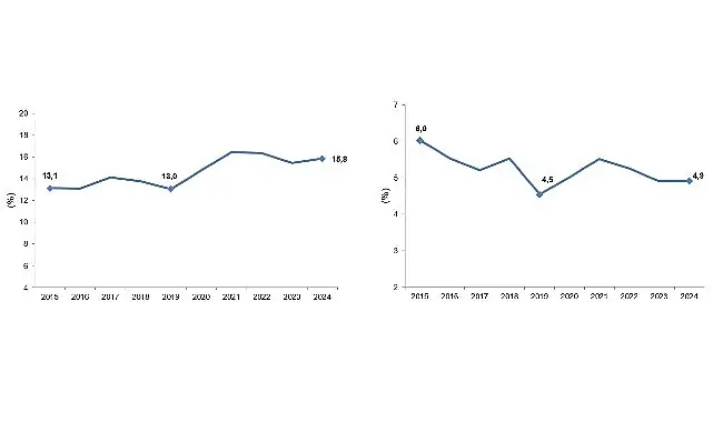 Girişimlerin doğum oranı (%), 2015-2024                                  Doğan girişimlerin istihdam yaratma payı (%), 2015-2024