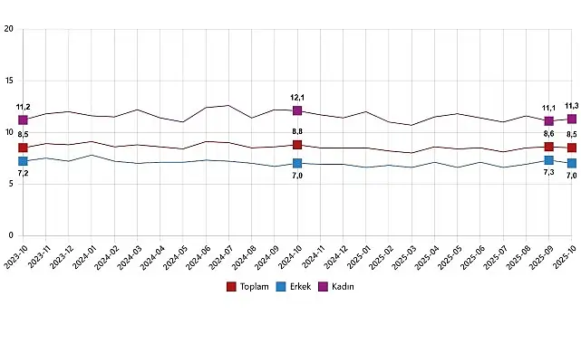 Hanehalkı İşgücü Araştırması sonuçlarına göre; 15 ve daha yukarı yaştaki kişilerde işsiz sayısı 2025 yılı Ekim ayında bir önceki aya göre 27 bin kişi azalarak 3 milyon 33 bin kişi oldu. İşsizlik oranı ise 0,1 puan azalarak %8,5 seviyesinde gerçekleşti. İşsizlik oranı erkeklerde %7,0 iken kadınlarda %11,3 olarak tahmin edildi.