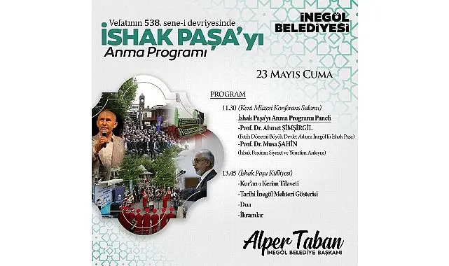 Son 2 yıldır düzenlenen ve artık geleneksel hale getirilerek İnegöl Belediyesi’nin organizasyonuyla bu yıl 3’üncüsü gerçekleştirilecek olan döneminin önemli devlet adamlarından İshak Paşa’nın vefatının 538. yılında anılacağı program için İnegöl Belediye Başkanı Alper Taban davet mesajı yayınladı. Başkan Alper Taban, “İnegöl’ümüzün yetiştirdiği, Osmanlı Devleti döneminin önemli devlet adamlarından, iki padişah döneminde Veziriazamlık yapmış İshak Paşa’yı anma programımızı geleneksel hale getirdik. Bu yıl da 23 Mayıs Cuma günü saat iki özel programla anma programını gerçekleştireceğiz. 11.30’da İnegöl Kent Müzemizin konferans salonunda Prof. Dr. Ahmet Şimşirgil ile Prof. Dr. Musa Şahin’in konuşmacı olarak katılacağı panel ve akabinde Cuma namazı sonrası 13.45’te İshak Paşa Külliyesinde; Kuran-ı Kerim Tilavetleri, Tarihi İnegöl Mehteri gösterileri, dualar ve ikramlarla bir program icra edilecek. Her iki programa da tüm ilçe halkımızı davet ediyoruz” dedi.