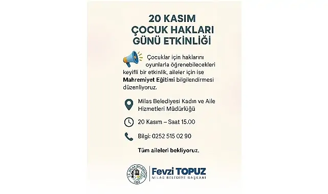 Milas Belediyesi Sosyal Yaşam Merkezi’nde düzenlenecek Çocuk Hakları Günü Etkinliği 20 Kasım 2025 Perşembe günü saat 15.00’de başlayacak. Etkinlikler hakkında detaylı bilgi almak isteyenler (0252) 515 02 90 numaralı telefonu arayabilecek. Düzenlenecek etkinliğe tüm aileler davet edildi.