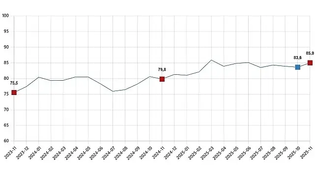 Türkiye İstatistik Kurumu ve Türkiye Cumhuriyet Merkez Bankası işbirliği ile yürütülen tüketici eğilim anketi sonuçlarından hesaplanan tüketici güven endeksi, Ekim ayında 83,6 iken Kasım ayında %1,6 oranında artarak 85,0 oldu.