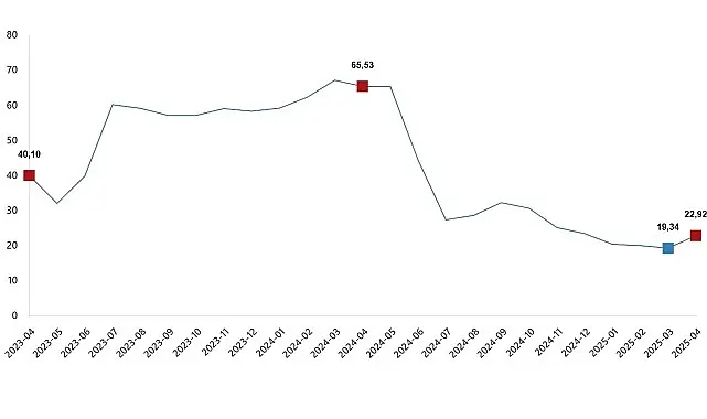 YD-ÜFE 2025 yılı Nisan ayında bir önceki aya göre %4,41 artış, bir önceki yılın Aralık ayına göre %13,10 artış, bir önceki yılın aynı ayına göre %22,92 artış ve on iki aylık ortalamalara göre %28,57 artış gösterdi.